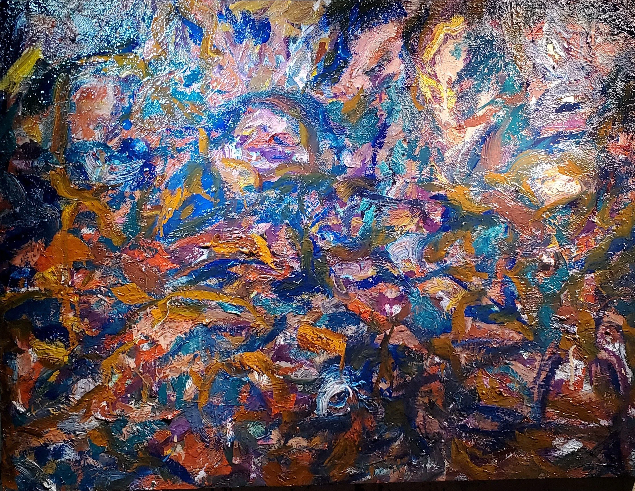 An abstract painting with vibrant, thick brushstrokes in various colors including blues, greens, pinks, browns, and whites.