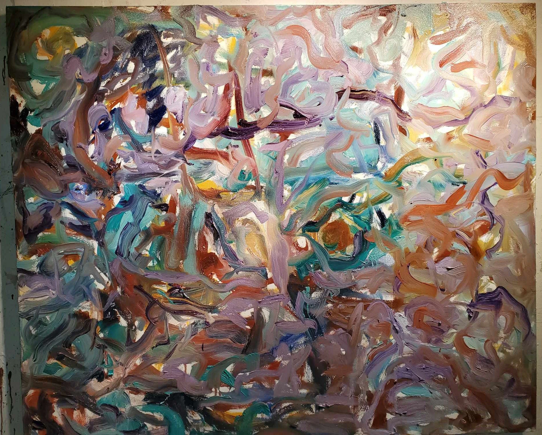 2025, An abstract painting with vibrant, thick brushstrokes in various colors including blues, greens, pinks, browns, and whites.